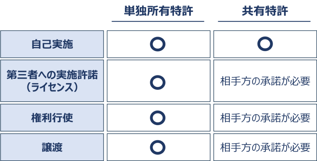 このように、共有とすると、自己実施は自由であるものの、第三者へのライセンス、権利行使、譲渡など極めて多くの事柄について相手方からの承諾を必要とし、アクションが制限されることになります。